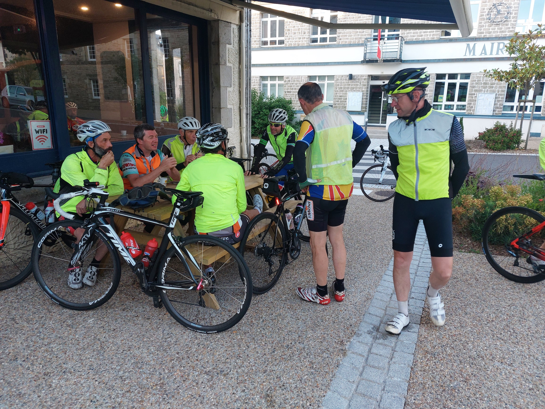 La météo nous avait annoncé des averses orageuses en après-midi et bien les cyclos ont été douchés pendant un arrêt consécutif la rupture d’un câble de dérailleur et jusqu’à La Trinité Porhoët où le sympathique tenancier du bar nous attendait pour tamponner les cartes de route. Cet arrêt fut mis à profit pour définir la suite du brevet. Il est décidé de s’accorder une pause nocturne de 6h à Pontivy afin de repartir groupés le lendemain à 4h30.