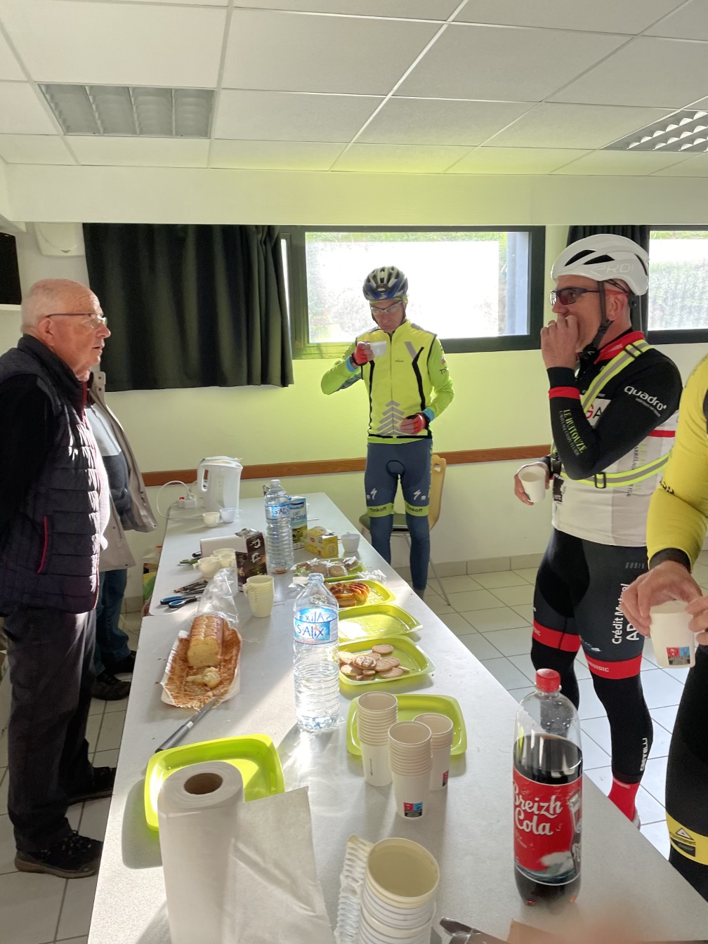 Quelle animation en ce dimanche matin 4h30 au complexe sportif. Tous les cyclos sont fins prêts pour affronter la seconde boucle vers Plouray, Guingamp, Pontrieux, Quintin plus accidentée que celle de la veille avec le passage d’un col à 285m d’altitude. A Plouray, les responsables de la boulangerie/café avaient été prévenus de notre passage à 6h30. Au vu de la montagne de viennoiseries nous étions attendus et ils furent très efficaces. Parfait.