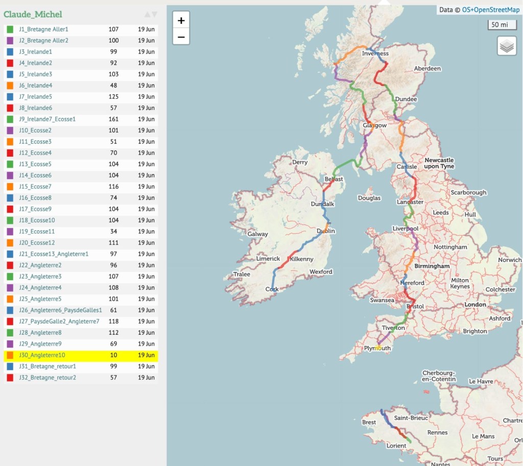 Nos bivouacs se sont poursuivis : une nuit à 63 km de Plymouth parmi les moutons, puis dans un champ fraîchement arrosé de lisier après une montée difficile due à une erreur de GPS. Enfin, nous avons été accueillis chez notre nièce, Sandra, à Plymouth, qui nous a fait visiter la ville et a conclu cette étape anglaise de notre voyage. Si tout seul on va plus vite, ensemble on va plus loin !